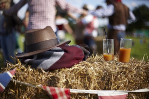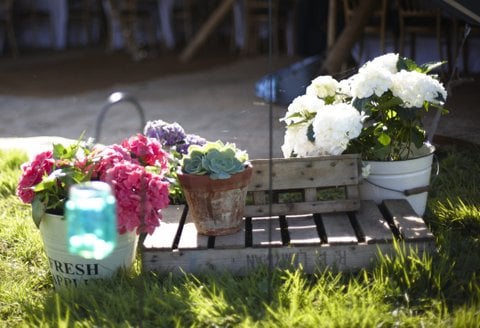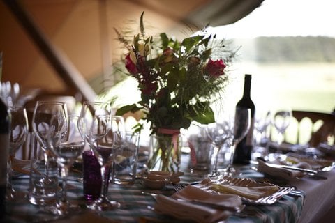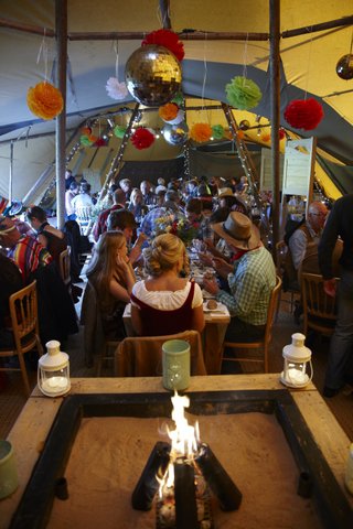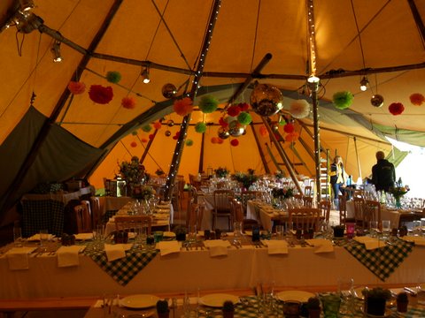 We booked two PapaKata teepees and a catering tent big enough for 110 adults and 30 children. We decorated the PapaKata with waxed paper pom poms in orange, greens and reds and hung them from the wooden poles inside. We had trestle tables laid with hessian and gingham cloths, jugs of flowers and cactus not fogetting lots of coloured glass tea lights. We even had some big old Saloon doors made to enter the Saloon bar!
