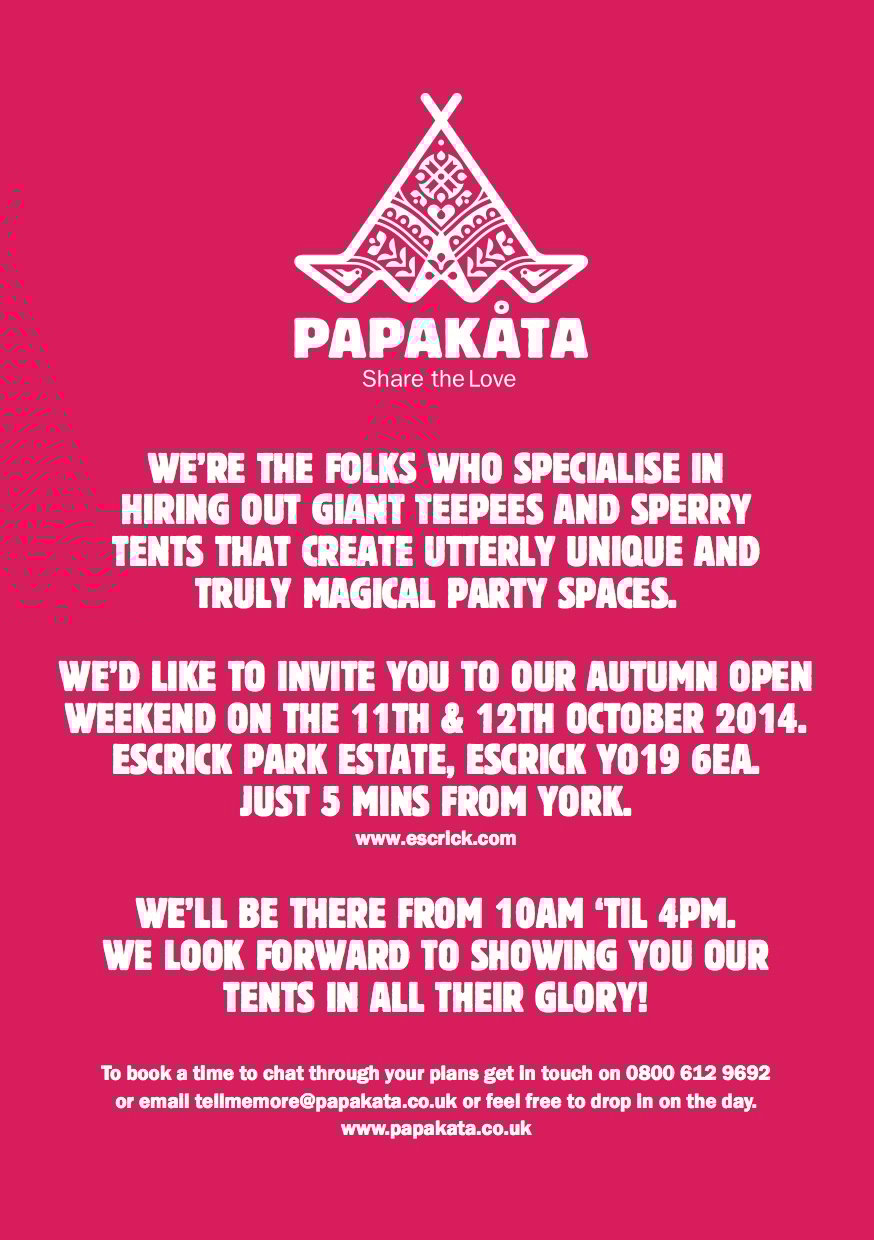 Whilst we’re all enjoying an Indian Summer, it’s hard to believe it’s only two weeks to go until our Autumn Open Weekend. And this time we’re so excited to be bringing our teepees and Sperry tents together at the beautiful Escrick Park near York.
