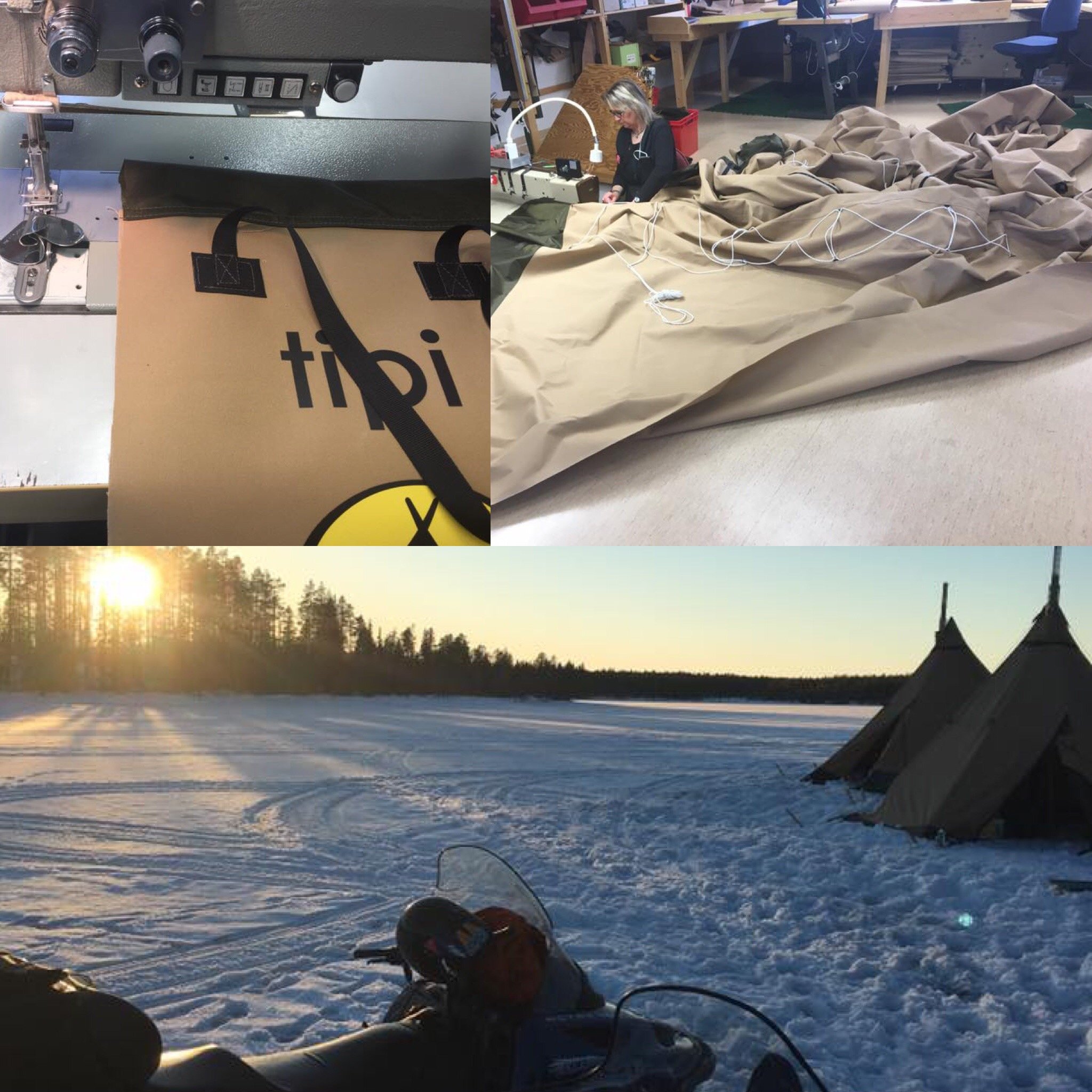 Chris and Damien hopped on the plane to Arvidsjaur, via Stockholm. No time to waste – straight to the original Tentipi factory for a lesson in sewing teepee canvas! The Papa Team were very impressed with their Tipi shopping bag’ creations!