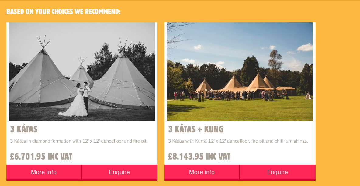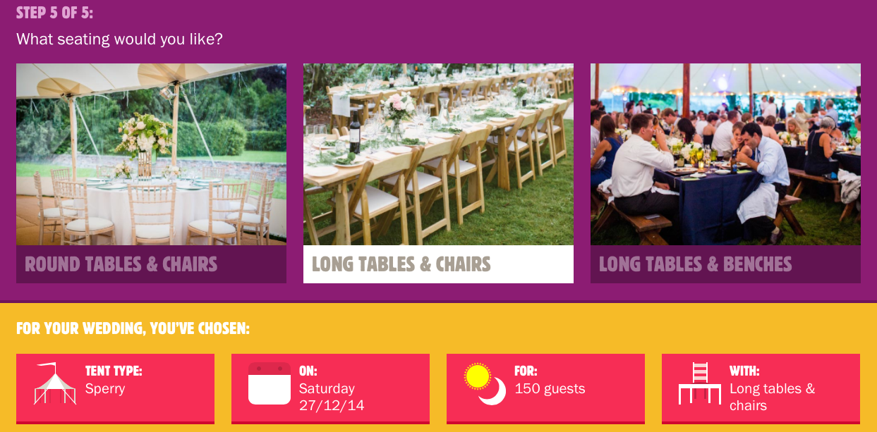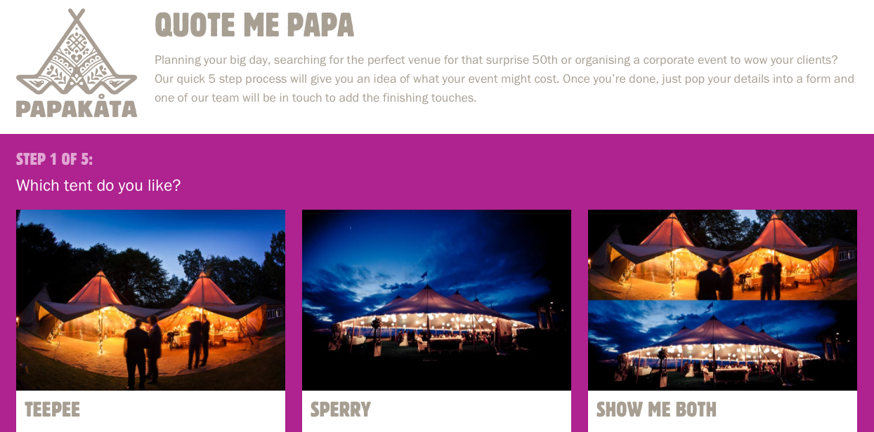 Simply click here visit the Quote Me Papa microsite and have a play! Follow a simple five-step process, and find out what your wedding tent might cost in an instant. Once completed, you can choose how and when to be contacted by one of the PapaKåta team.