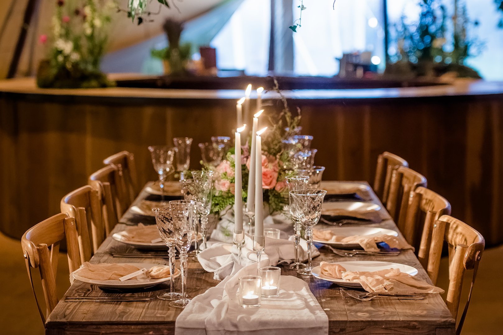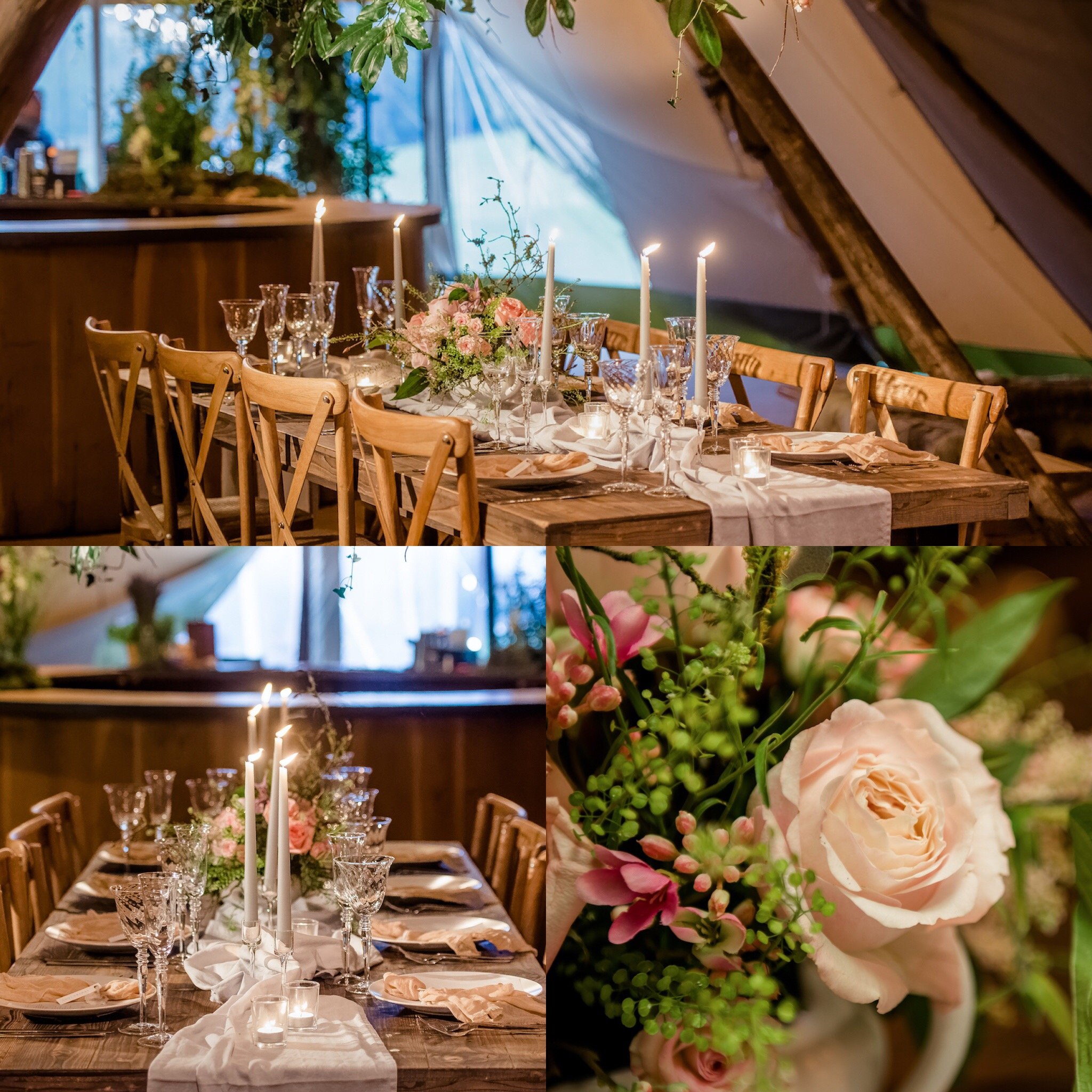 Farmhouse luxe furnishings added to the Teepees rustic charm. With exposed unclothed farmhouse tables bringing authenticity and a homely warmth. Whilst on-trend cross back chairs complemented the set-up, bringing a grown-up elegance and providing comfy seating for guests.