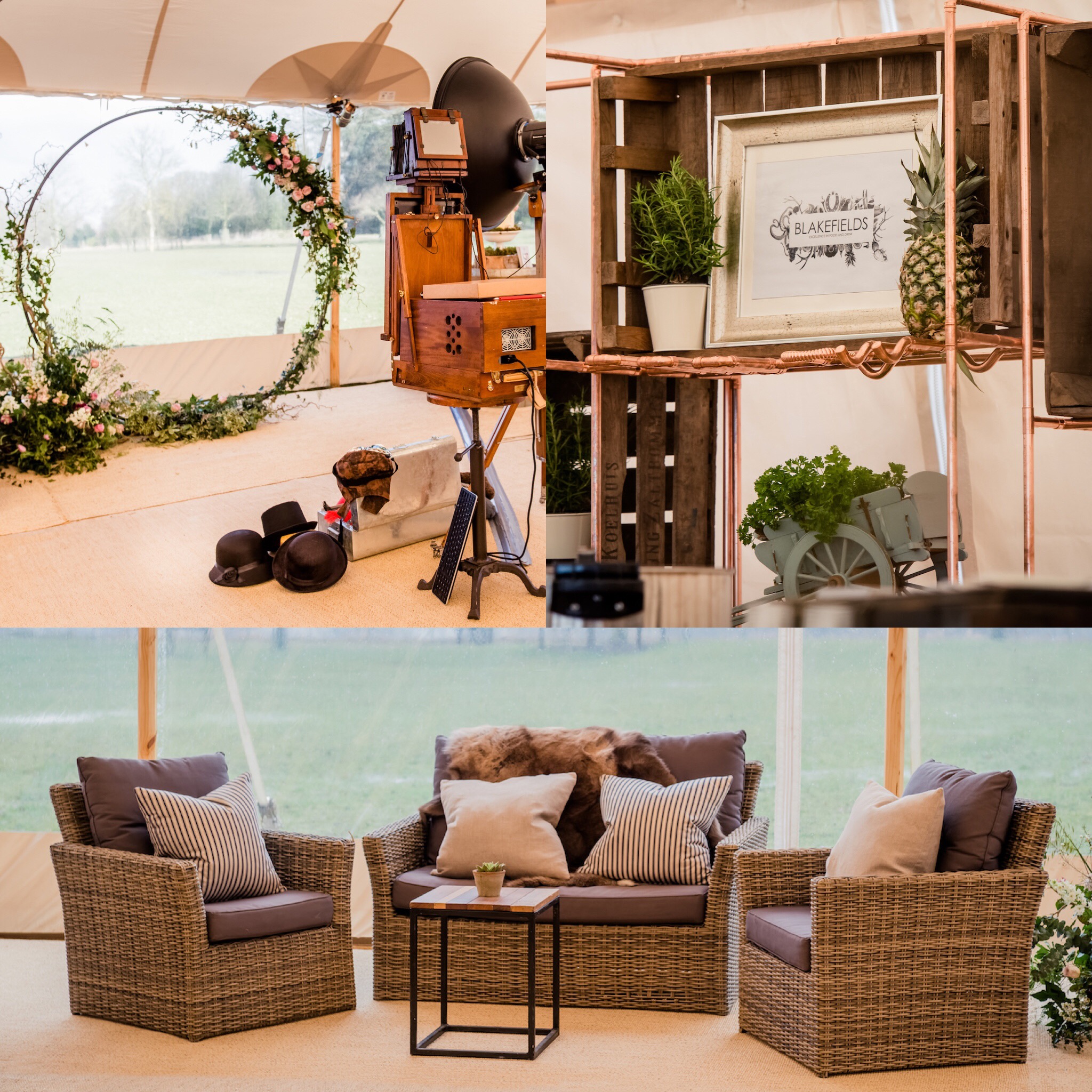 PapaKåta Spring Open Weekend Sperry Tent furnishings, Floral Moongate by Leafy Couture, Booth Revolution vintage photobooth, Rattan Sofa Set.