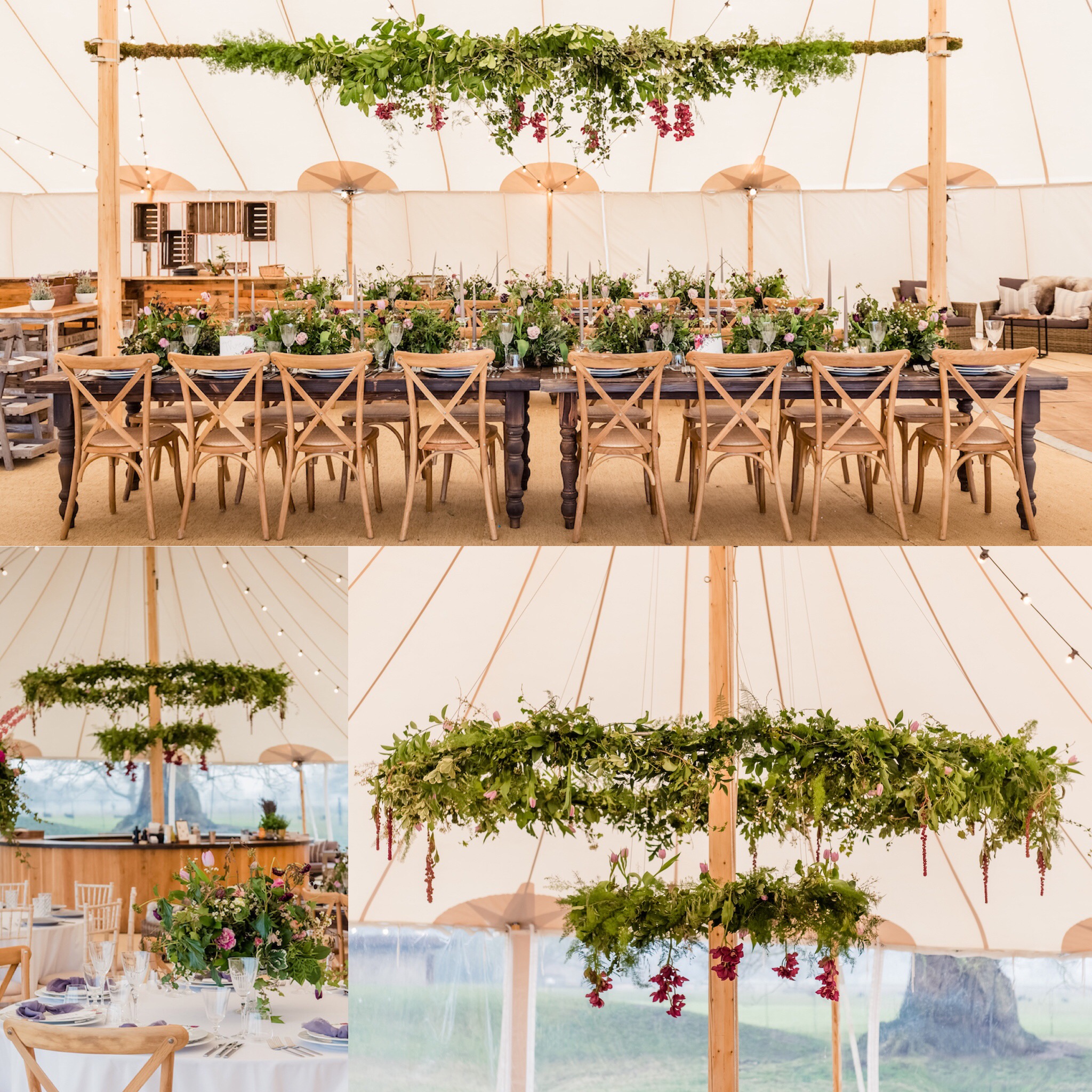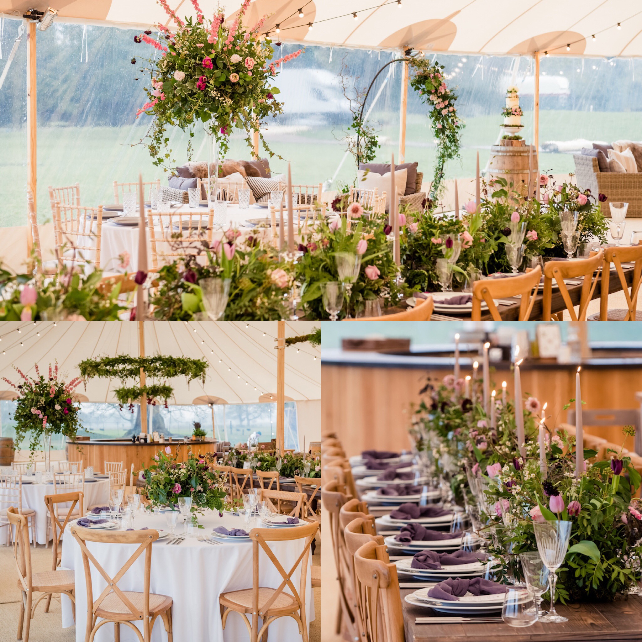 A stunning Two-tier Hoop and Floral Beam created a dramatic focal point, drawing the eye up with luscious foliage and bright florals, creating a striking contrast against the oyster-coloured canvas of the Sperry Tent.