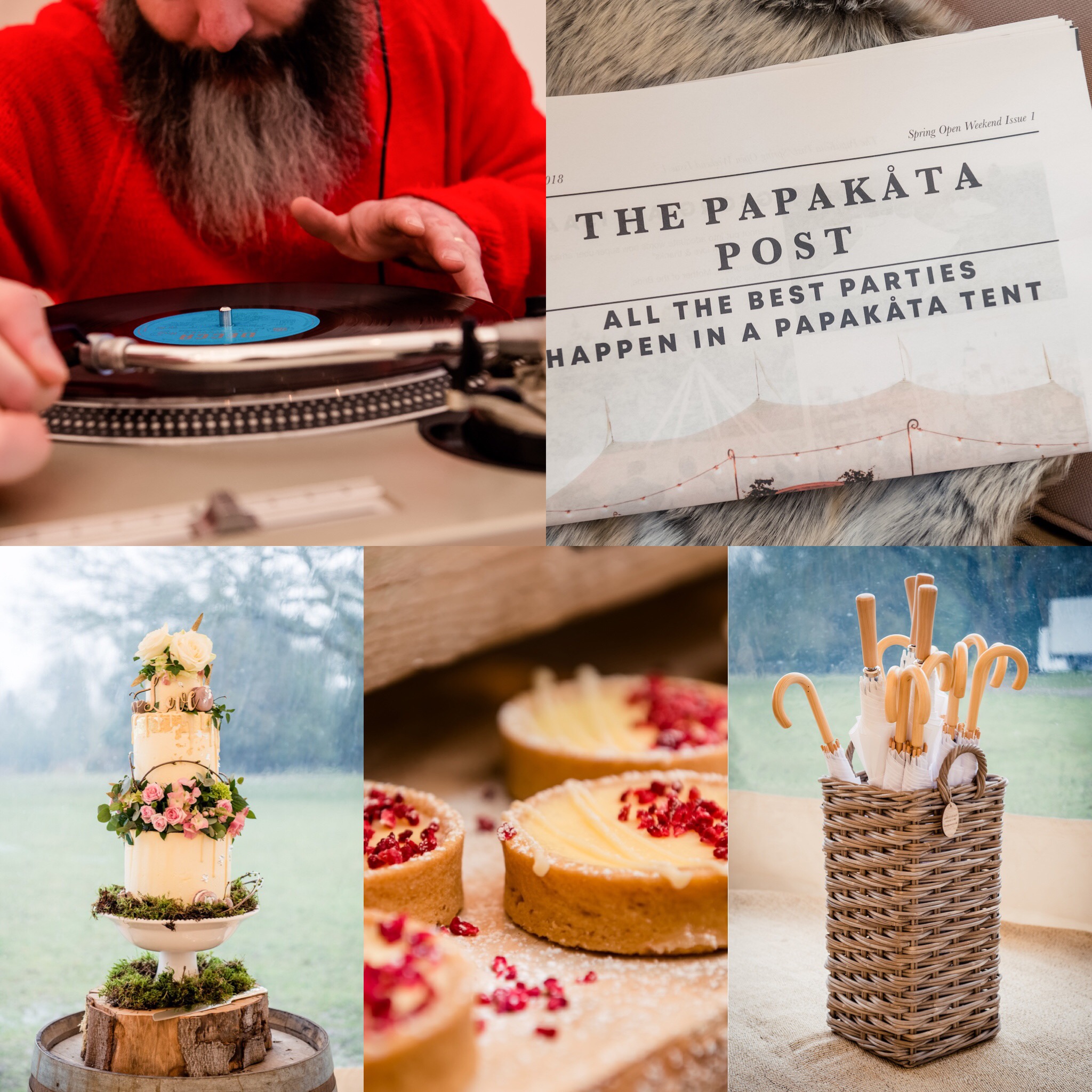 PapaKåta Spring Open Weekend Sperry Tent Suppliers, DJ – Upside your Mind, The PapaKåta Post by The Newspaper Club, The Barn Bakery Event Cake, Sweet Treats by Blakefields and Brolly Buckets event umbrellas.