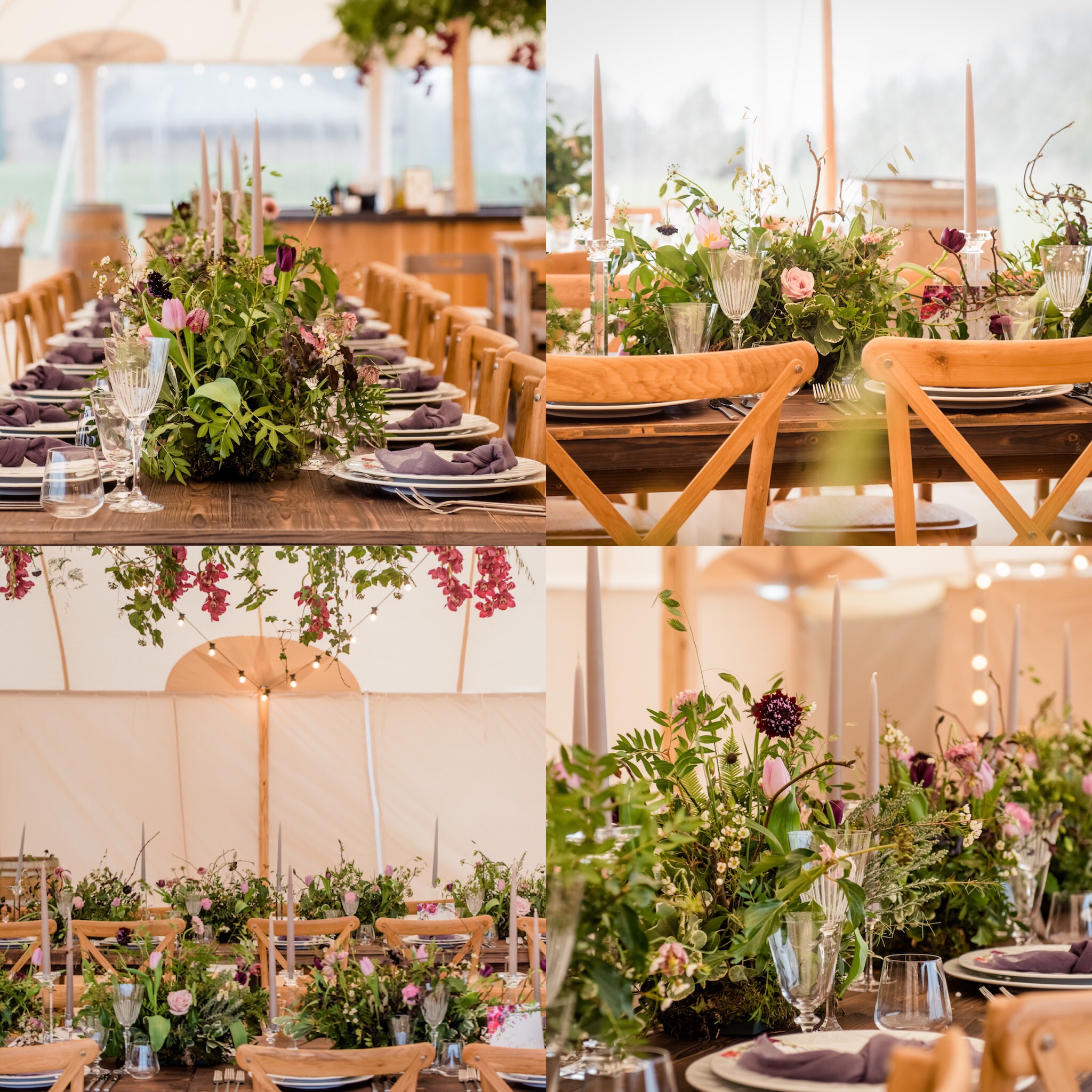 PapaKåta Sperry Tent tablescapes with florals by Leafy Couture, table linens by Silk & Purl, tableware by White House Event Crockery