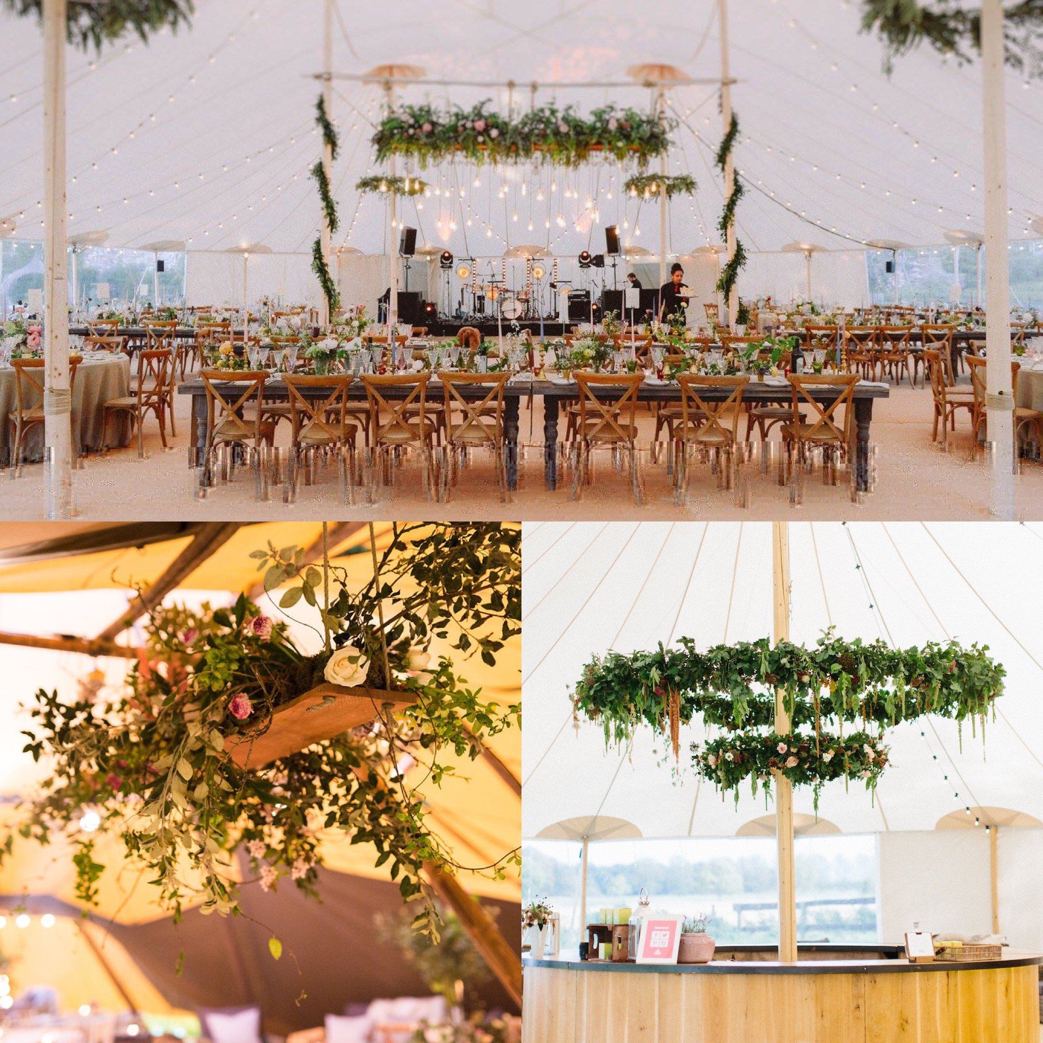 Always ones to embrace a hanging installation, we turn to our green-fingered friends for ways to create an eye-catching linear design that sits horizontally above our Farmhouse Tables. Our Floral Beam or Wooden Swings are perfect for bringing focus to the Sperry Tents’ awe-inspiring height and the beautiful handcrafted detail of the canvas. Meanwhile, in the Teepees, the linear designs take advantage of the rustic wooden cross poles and allow you to create an ethereal garden within with low hanging florals and foliage.