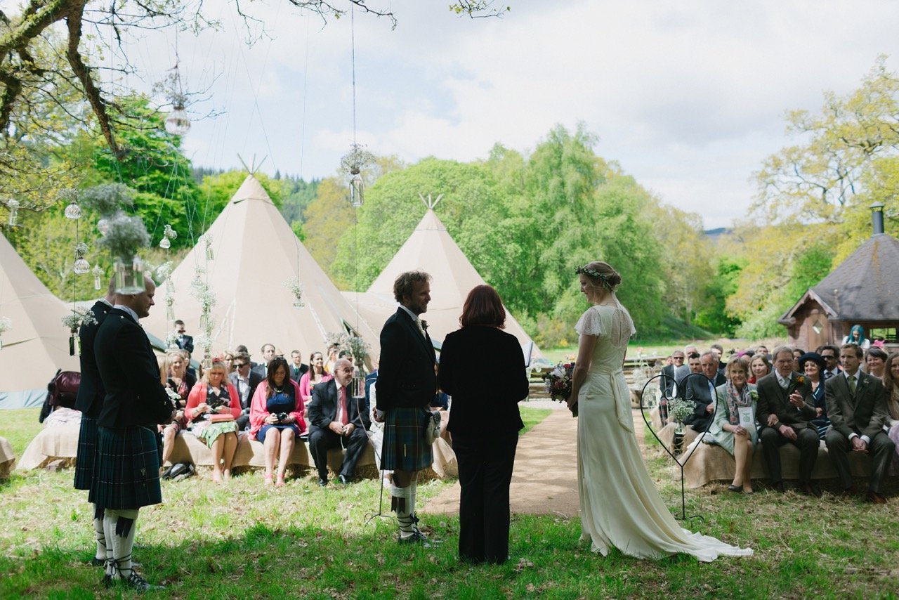 In Scotland, you can be married legally by a celebrant who is authorised by the Registrar General of Scotland – anywhere in Scotland. We are not constrained to licensed venues so a PapaKåta Tipi or Sperry tent is ideal in the venue of your choice. The Celebrant or Officiant can be a religious minister or priest, Civil Registrar or a celebrant of a ‘belief system”. The most popular in Scotland are Humanist Celebrants but there are many others, for example, interfaith or spiritualist. There are around 8 Humanist organisations in Scotland, all of which have authorised celebrants. The Humanist Fellowship of Scotland is a warm, relaxed, friendly and professional group who love our couples and are personal and focus on the wishes of our couples. We can help you find a celebrant for your date and venue. You do not need to have a ceremony with a registrar beforehand. The whole ceremony is legal as long as you have these 7 things and say these 7 words: