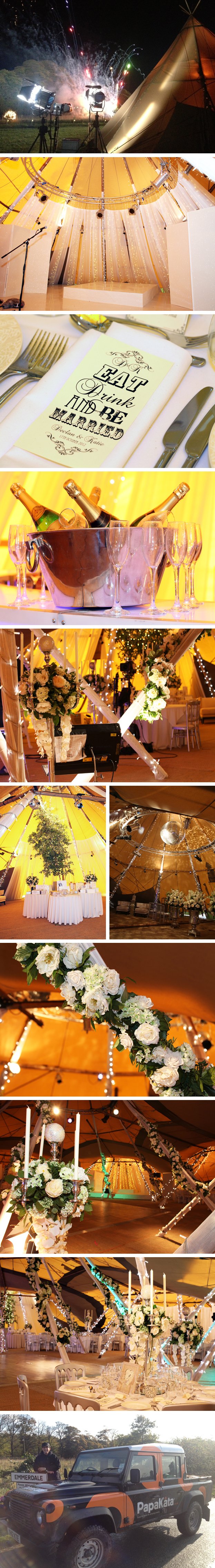 Furnishings: Candelabras, White muslin drapes, Teepee poles with floral garlands, Trevor the giant mirror ball, Dance floor, Fairy lights, Moroccan lanterns, Pedestal lanterns, Stage, Bar and Fairy light festooned silver birch tree
